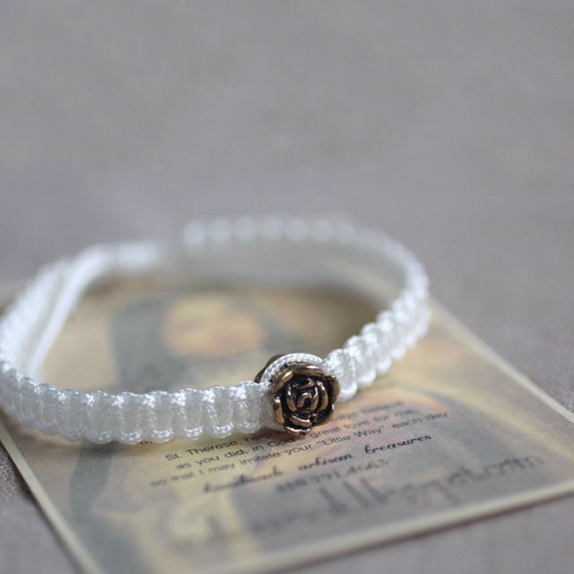 This adjustable handmade bracelet features a bronze rose medal in its center. Roses have been described and experienced as Saint Therese's signature. Countless millions have been touched by her intercession. Therese's spirituality is of doing the ordinary, with extraordinary love. May you wear this bracelet as a reminder to imitate her “little way.” Prayer card included.